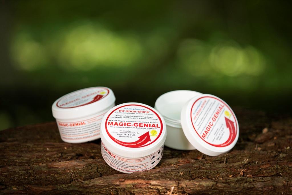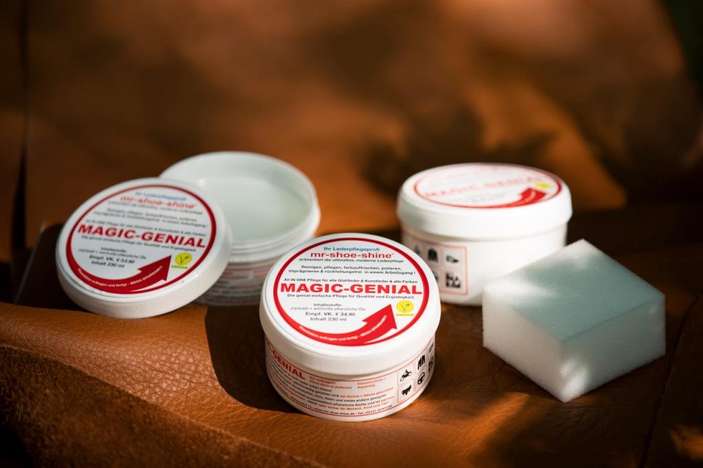 Mit Magic-Genial, dem Topprodukt im Sinne einer nachhaltigen Lederpflege, fällt die Wahl auf ein natürliches Erzeugnis aus rein pflanzlichen Wirkstoffen. Im Gegensatz zu Sprays auf chemischer Basis, ist das lösungsmittelfreie Magic-Genial der Garant für schonende Pflege bester Qualitätsleder. Es gibt Leder die Geschmeidigkeit zurück und erhält die natürlichen Vorteile des seit Jahrtausenden genutzten Naturprodukts. Ihre Schuhe werden glänzen wie am ersten Tag.