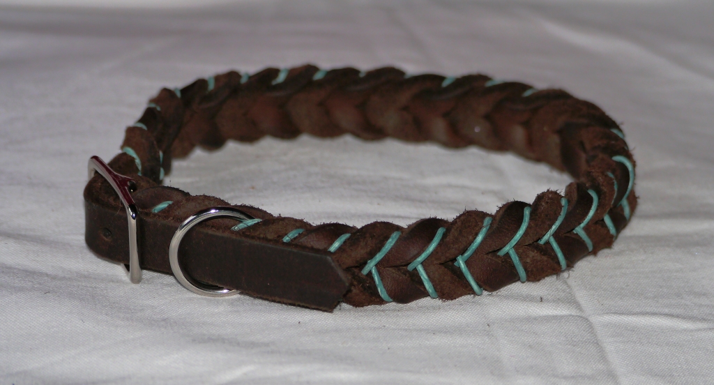 Das Halsband ist mit Dornschnalle ohne Zugeigenschaft zu tragen, formschön geflochten, maximale Lederbreite von 15 mm,